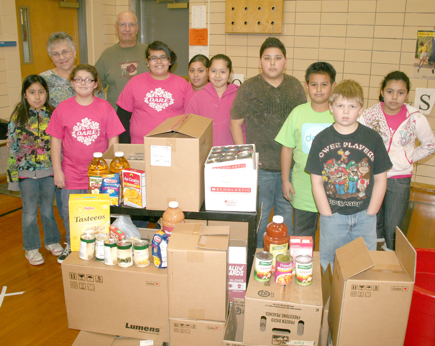 During an assembly Friday the food was given to Loren and Diane Upah from the Emergency Food Box. Diane Upah told the students to give themselves a hug and remember that feeling, for the donations they provided were going to give comfort to those in need during the holiday season.
