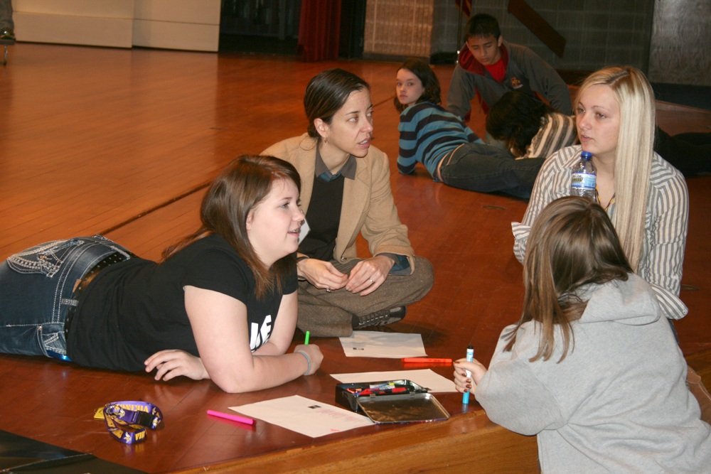- L to R: Summer Witte, guest poet Yvette Hermann, Natlie Kueny, Nicole Lacina decide how to preform their poem during a workshop Friday morning.