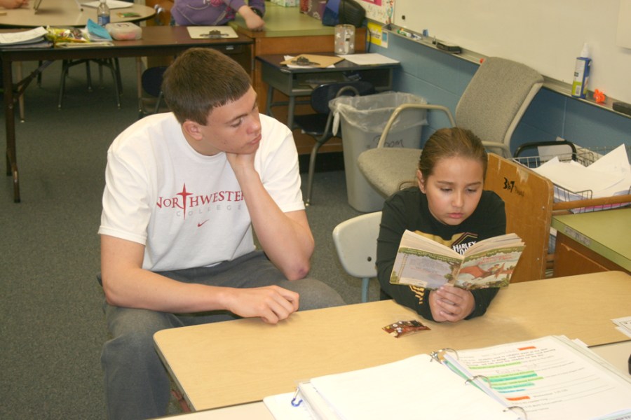 Bobcat baseball player Hunter Hillygus reads with a student in Mrs. Friday’s class at Hoglan Elementary.