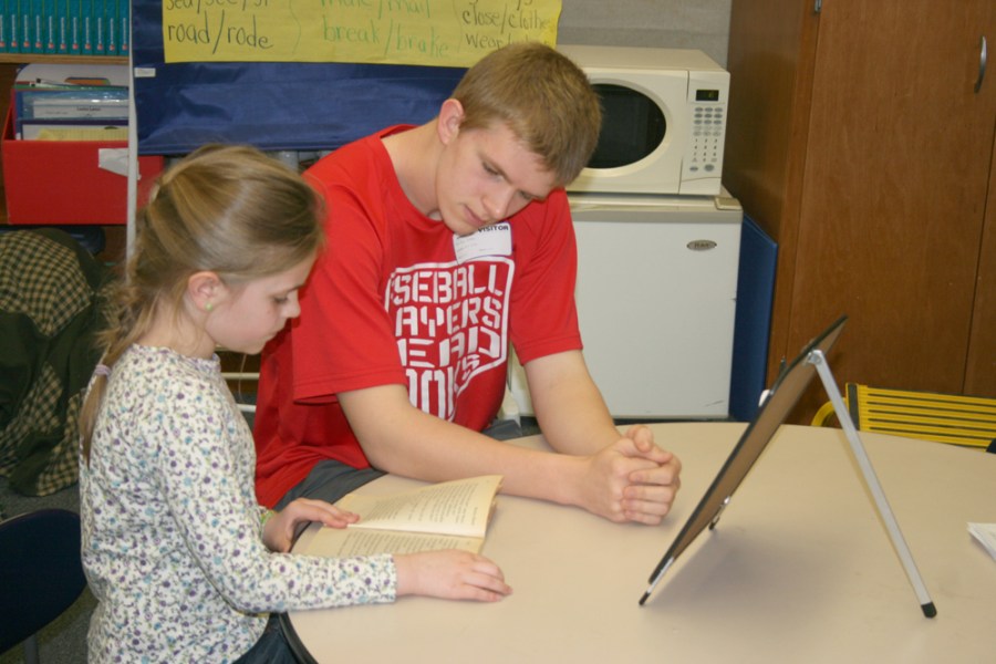 Bobcat baseball player Matt Battles reads with a student in Mrs. Friday’s class at Hoglan Elementary.