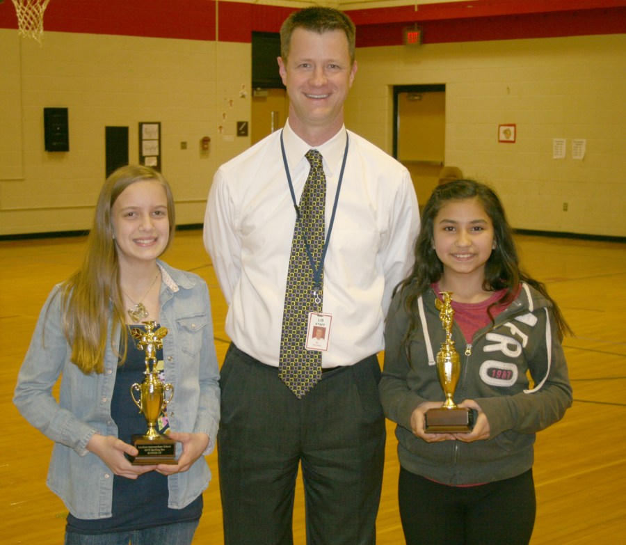 Spelling bee winner Abril Alcaraz (right) and runner-up Eve Nettesheim (left) with Principal Ralph Bryant.