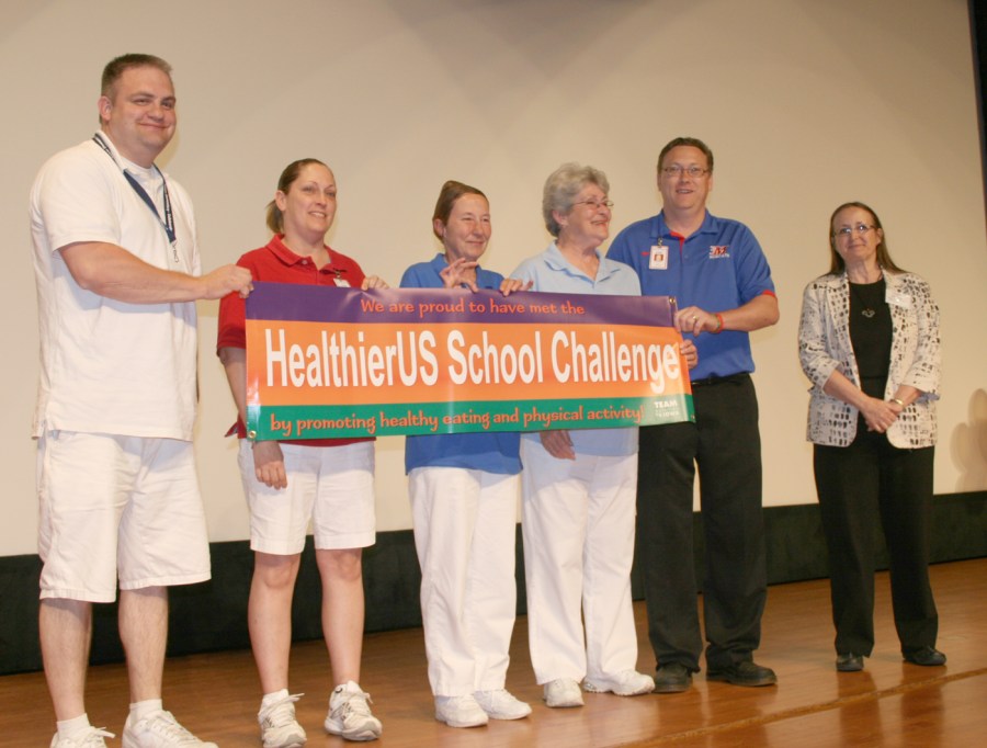 L to R: Food service employees Seth Ringgenberg, Wendy Mohler, Patty Martin, Calvin Scales and Vickie McVey hold up a banner presented to them by Ann Feilmann, Bureau Chief of the Iowa Department of Education Nutrition and Health Services.