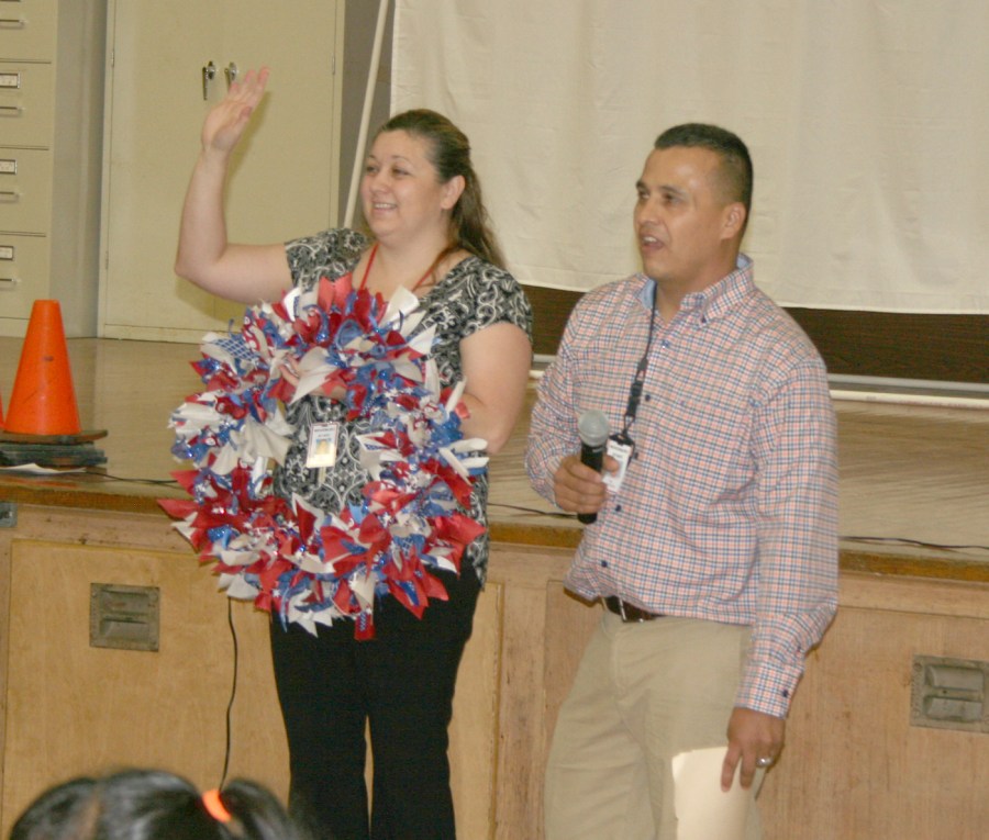 Woodbury Principal Anel Garza holds a wreath made from red, white and blue ribbons that spent a year tied to the fence outside Woodbury Elementary in honor of Mr. Ortega.