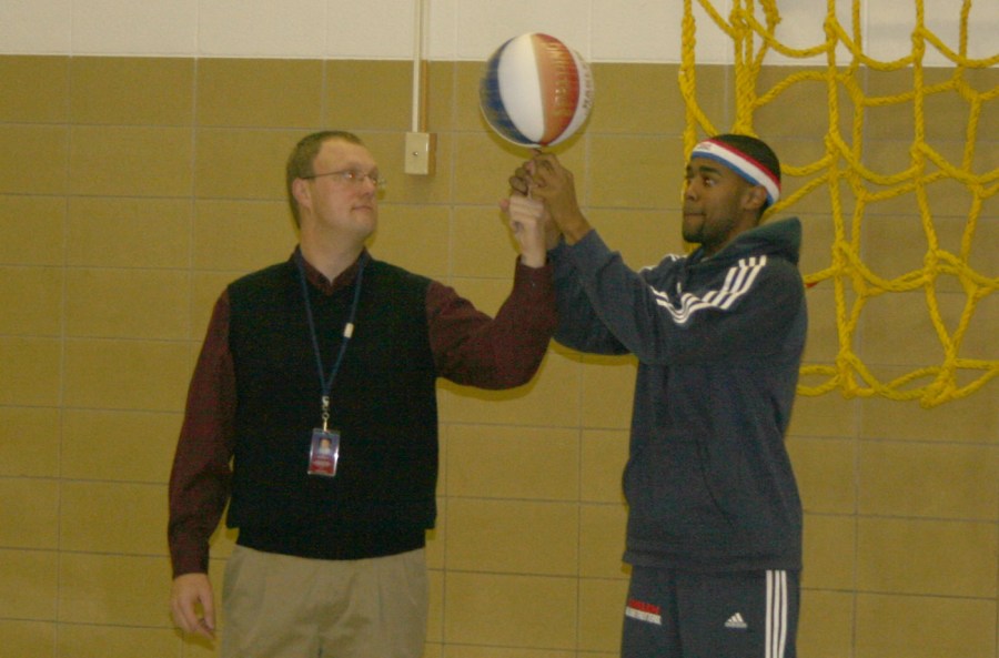Harlem Globetrotter Brawley “Cheese” Chisholm teaches Franklin Principal Tim Holmgren to spin a basketball on his finger during an assembly at the school Monday. Chisholm also visited Miller Middle School.