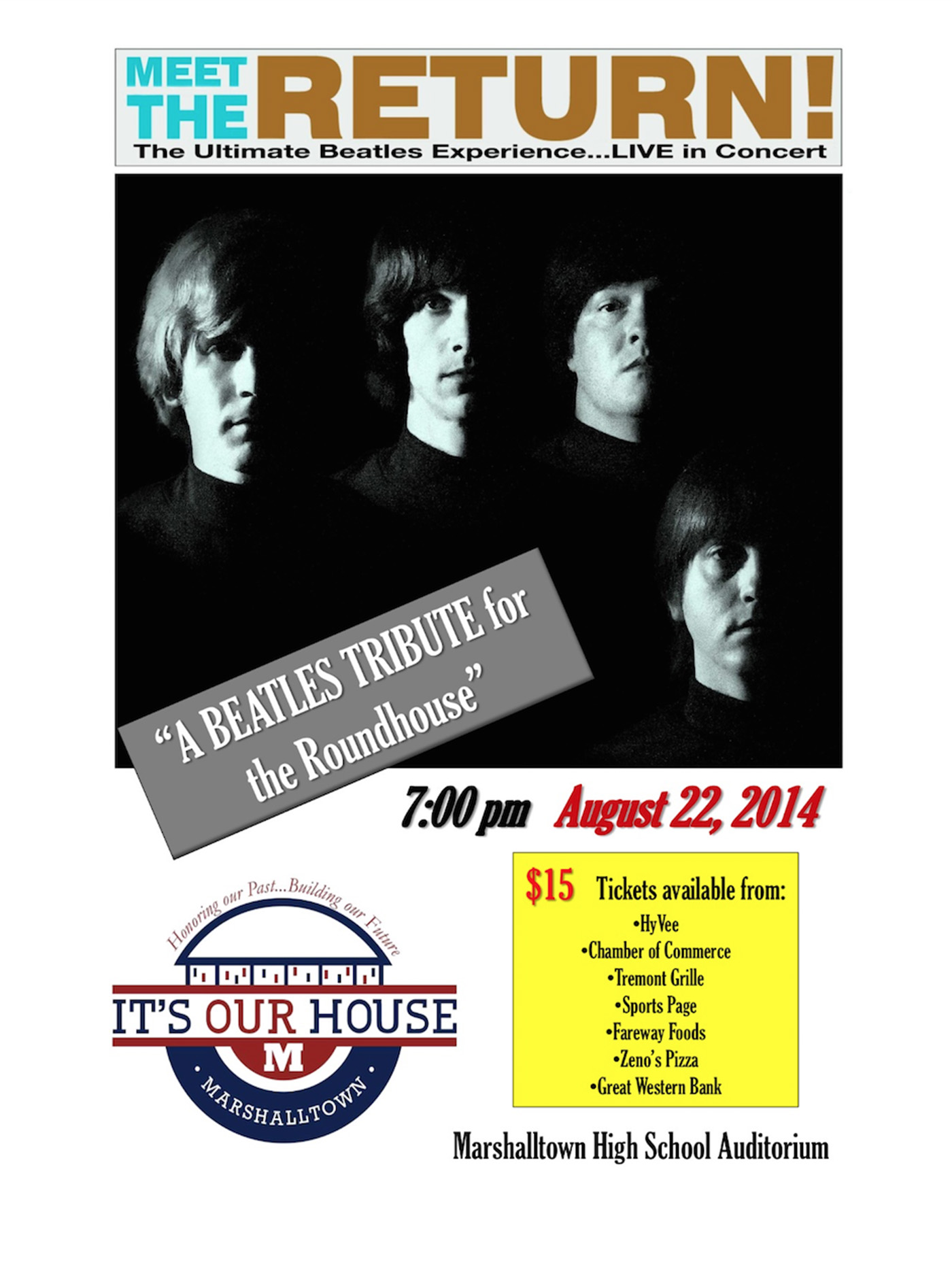 The concert will be held at the Marshalltown High School/Community Auditorium at 7 p.m. on Friday, Aug. 22. The number of tickets is limited, so it’s recommended to purchase tickets in advance. Tickets are available at Hy-Vee, Fareway, Zeno’s, Great Western Bank (both locations), Sports Page, Tremont Grille, and the Chamber of Commerce. Each ticket is $15, and every dollar will benefit the Roundhouse renovation.