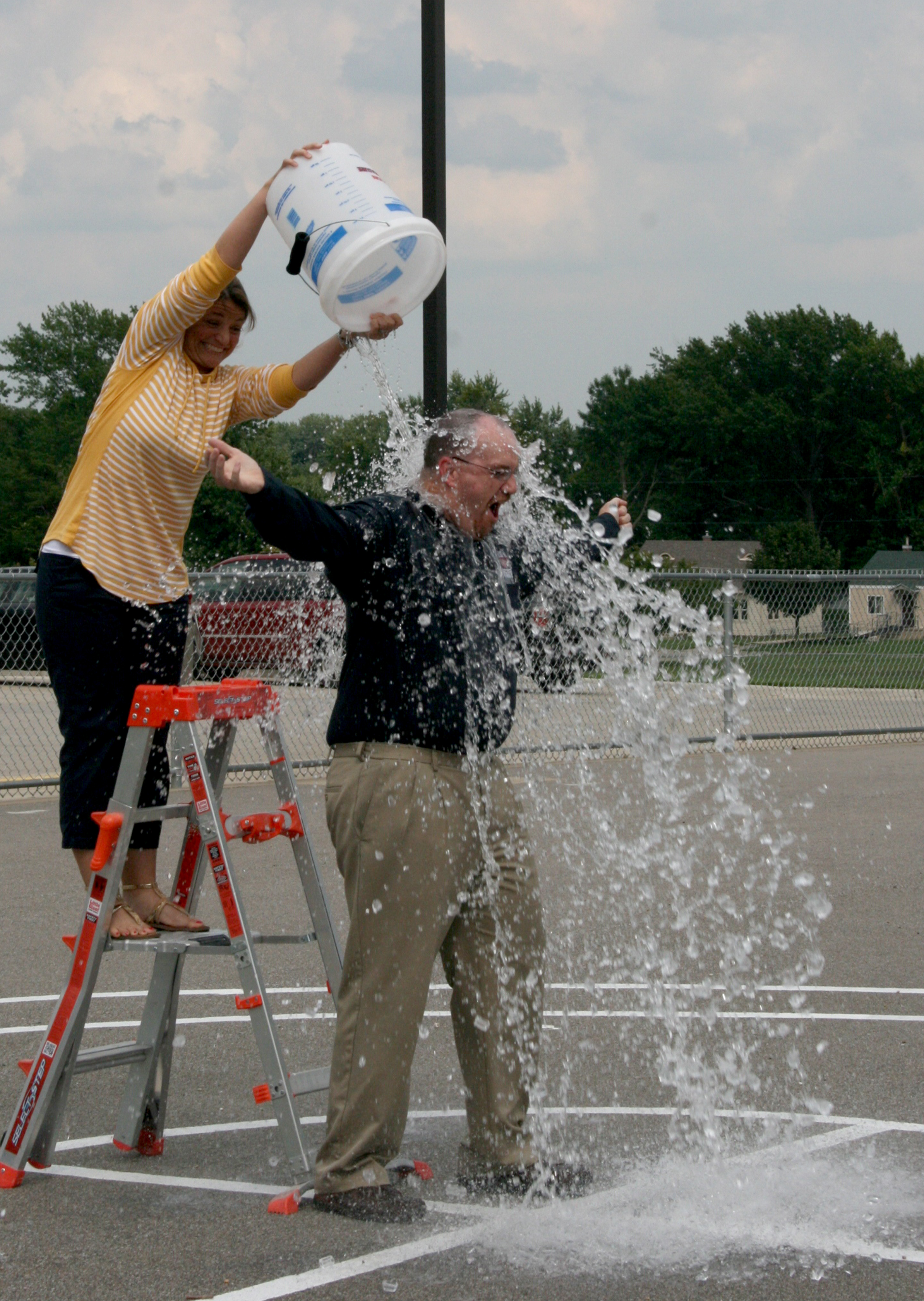 Anson Elementary took a slightly different spin on the ALS Ice Bucket Challenge. Principal Ronnie Manis challenged his staff to raise $100 for ALS research. If they did so, he’d take the challenge. In less than a week they raised $400 and this afternoon Mr. Manis stayed true to his word.