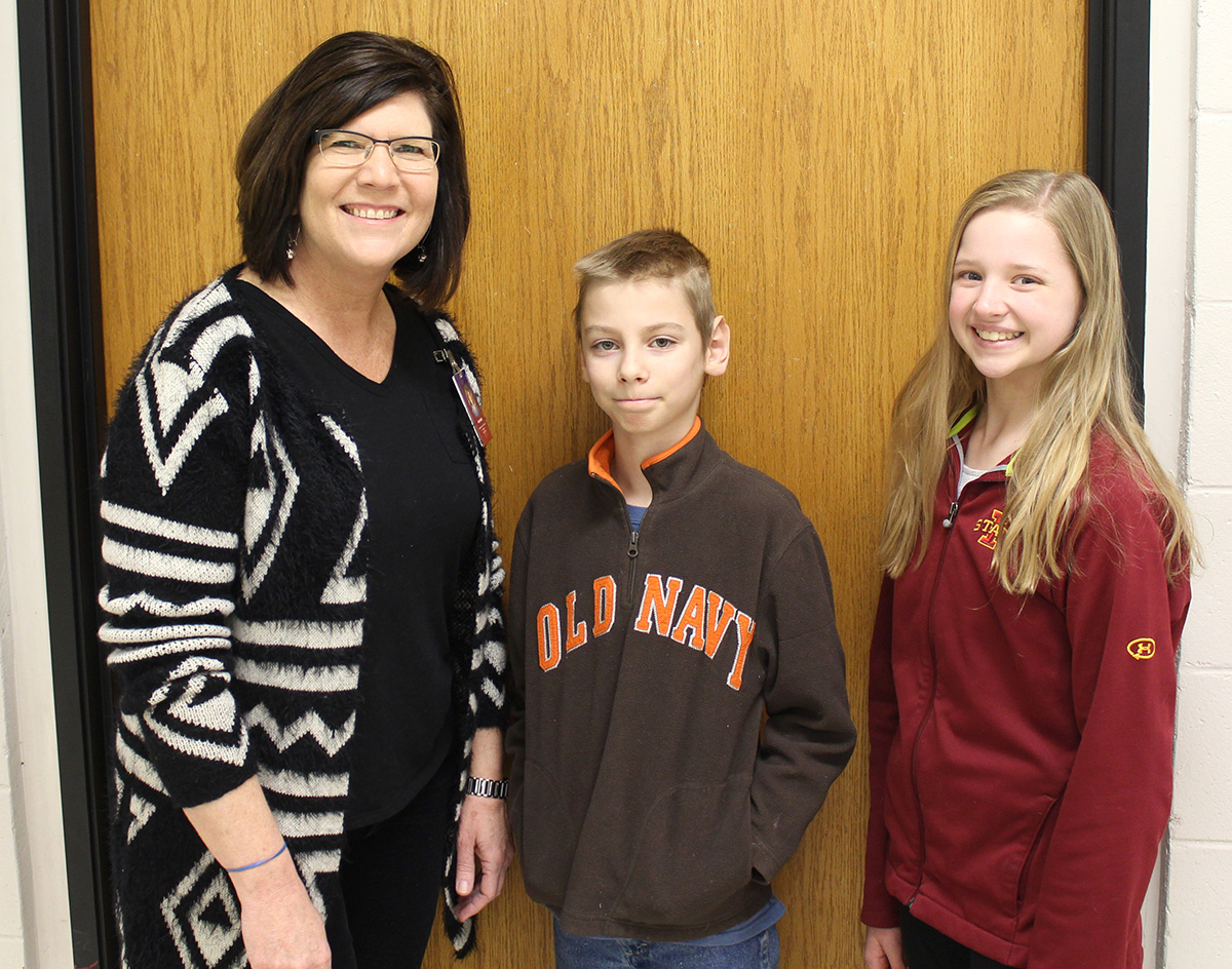 Lenihan Intermediate School art teacher Pam Muench is pictured with students Xander Harwell, center, and Megan Sills. The two students had work selected to be part of a statewide display during Youth Art Month in Des Moines in March.