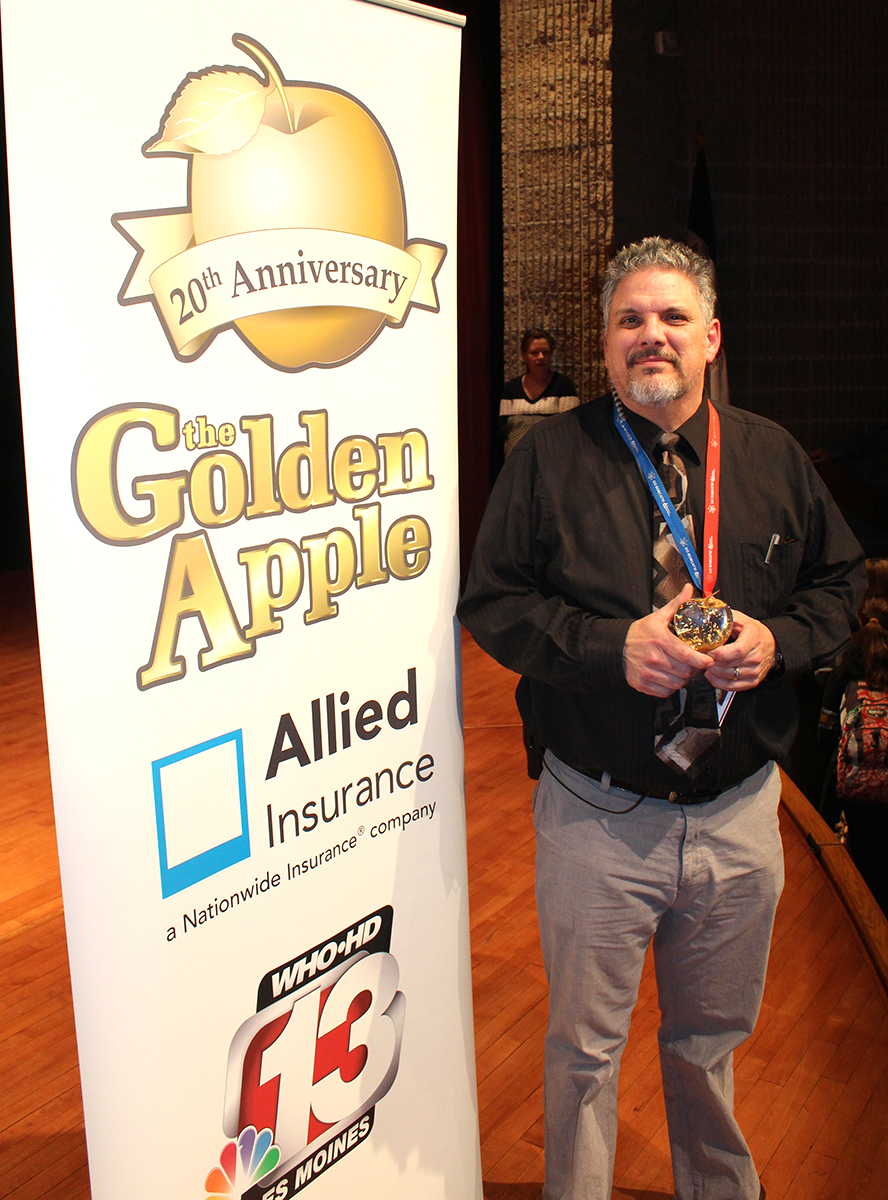 Scott Johannes, student resource specialist at Marshalltown High School recently received the Golden Apple Award from WHO-TV.
