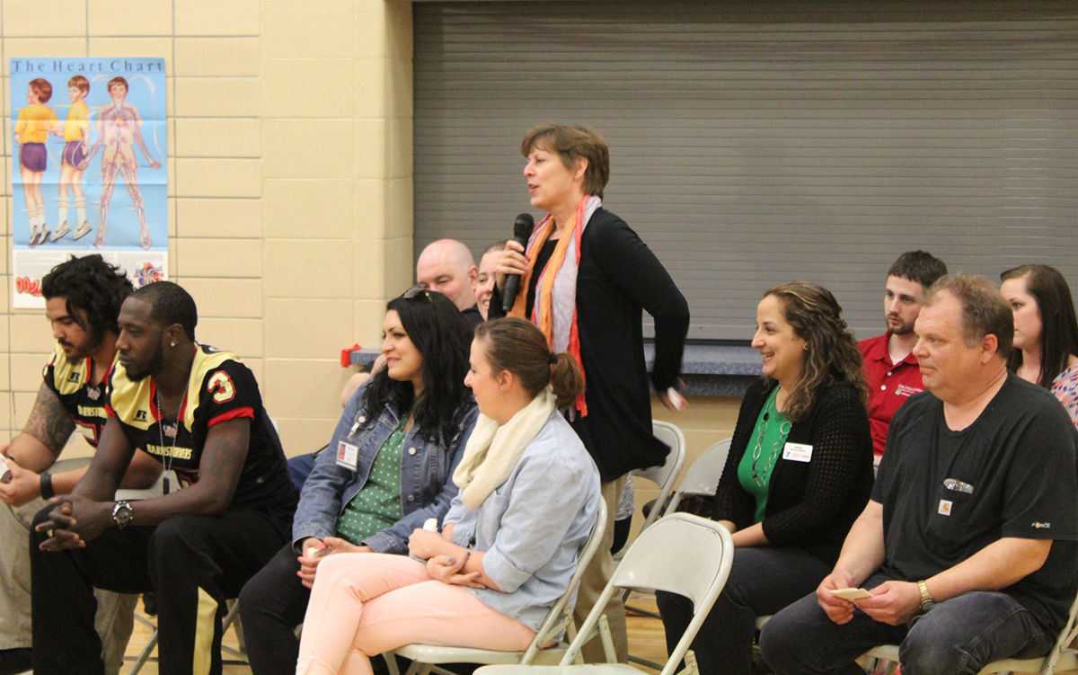 A total of 56 Rogers students were recognized for perfect attendance in the third quarter (Jan. 17 to March 20) and shook hands with professional football players Alex Gonzalez and Lemans Casimier of the Iowa Barnstormers.
