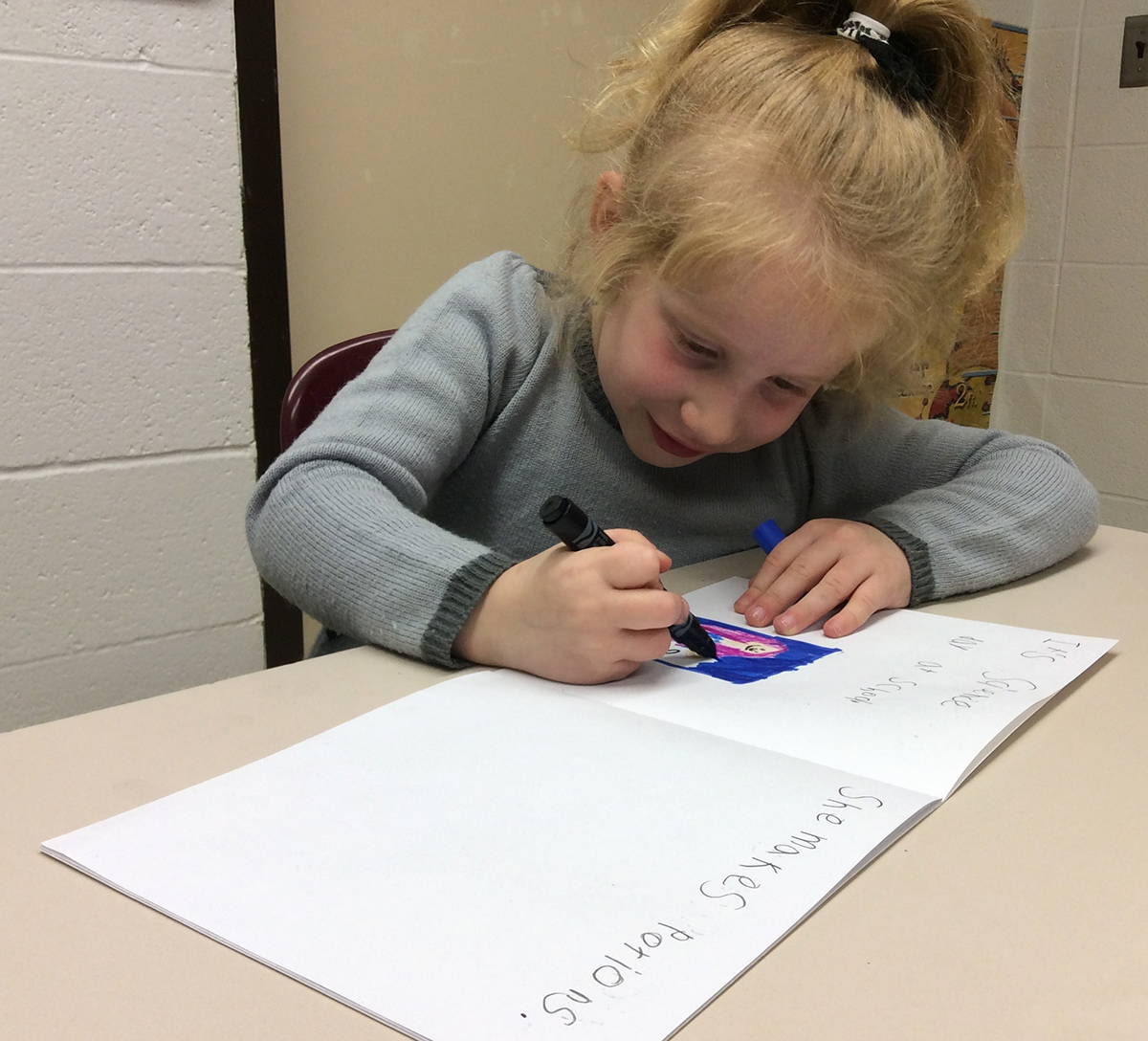 “It’s a Science Day at school. She makes potions. She sells them to kids. She meets a real scientist. She dresses up like a scientist. She uses a telescope. She discovers Mars. Anny programmed on the computer. She works with a leopard. Anny teaches it. She reads a science book. She does a science experiment. She takes the bus to home. She had a good day. The End.”