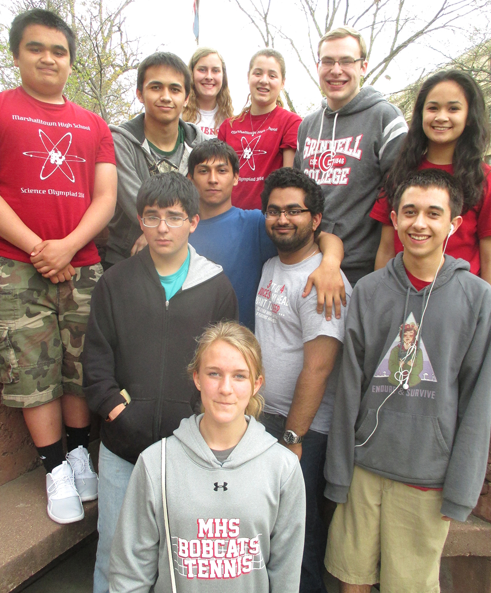 A team from Marshalltown High School placed sixth out of 20 teams at the Science Olympiad held at Coe College on April 18. Pictured from MHS are, front row, Maggie Grimm. Second row, Joey Escobedo, Jose Garcia, Sumeet Panchal and Juan Andrade. Back row, James Drummer, Ryan McDaniel, Jill Podhajsky, Whitney Canaday, Chandler Fisher and Mary Drummer.