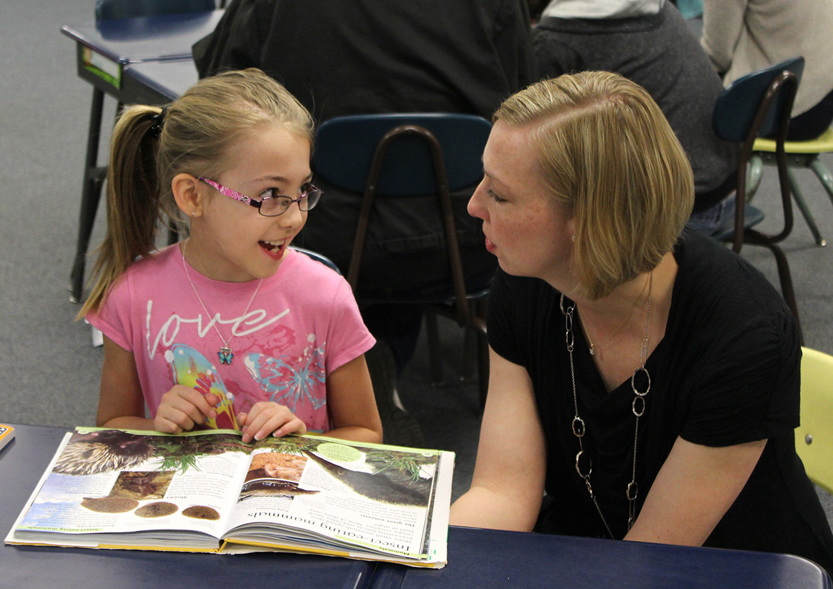 Hoglan Elementary School fourth grader Hannah Seltman reads to her mother Melissa Seltman during Cafe Hoglan on April 28. The event invites parents and other family members to come and read with students while enjoying breakfast.