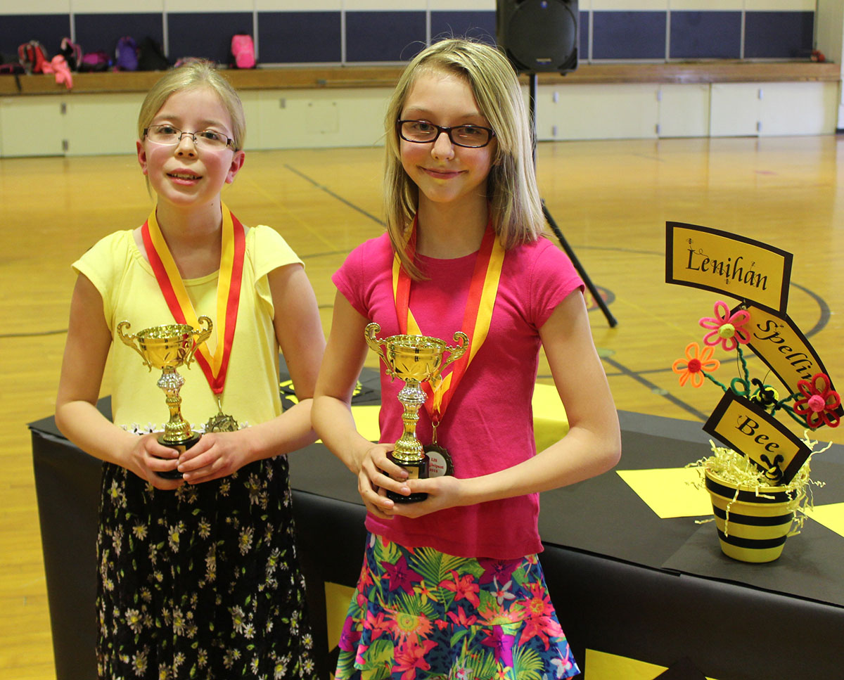 Lenihan Intermediate School held its annual spelling bee on May 5. Sixth grader Jade Tesar, right, came in first place for the second straight year. Also pictured is Rebekah Stone, a fifth grader who placed second in the contest.