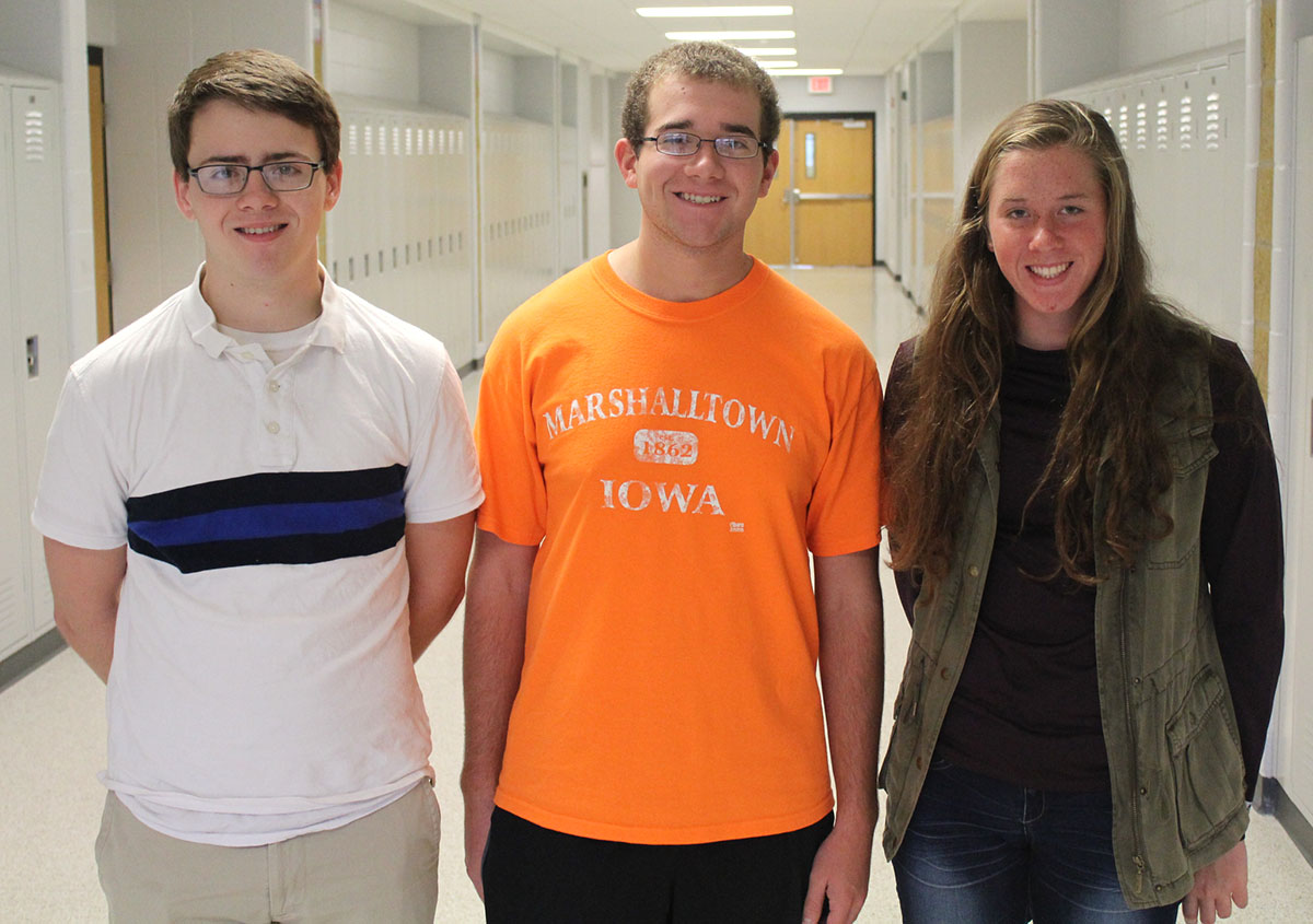 Three Marshalltown High School students have received recognition in the National Merit Scholarship Program. Collin Krukow, left, and Tim Potter, center, were named commended students and Ellyn Boland, right, is a national semifinalist.