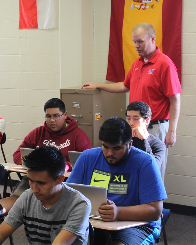 Marshalltown High School teacher James Christensen talks to his Spanish for the World of Medicine class on Oct. 8. The class took on a project to translate diabetes education documents from English to Spanish for Central Iowa Healthcare.