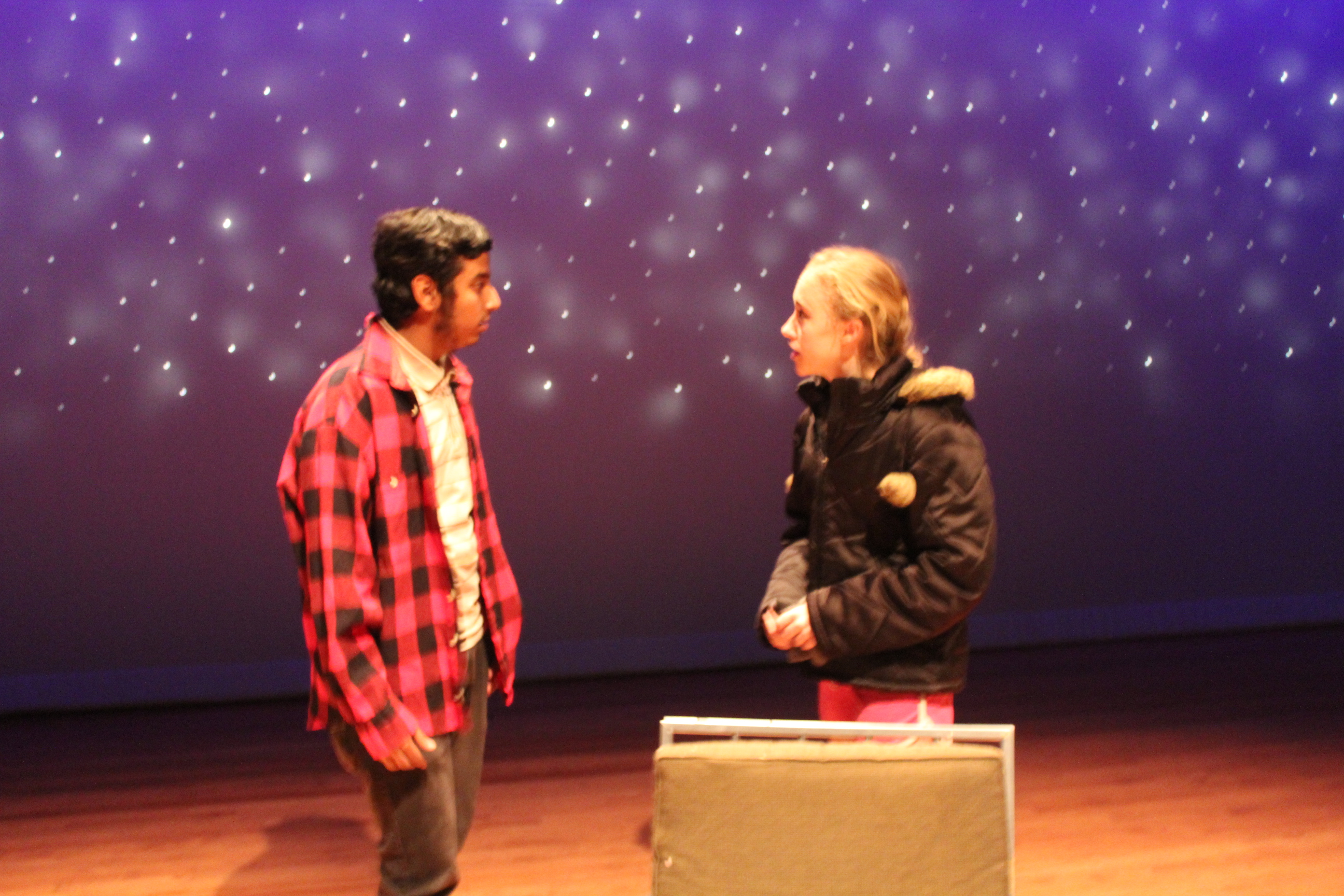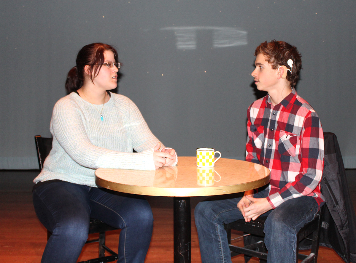 Maria Gerads, left, and Luke Pedersen rehearse a scene for the Marshalltown High School fall play “Almost, Maine.” The romantic comedy will be performed at both 7 p.m. on Friday and Saturday at the MHS/Community Auditorium.