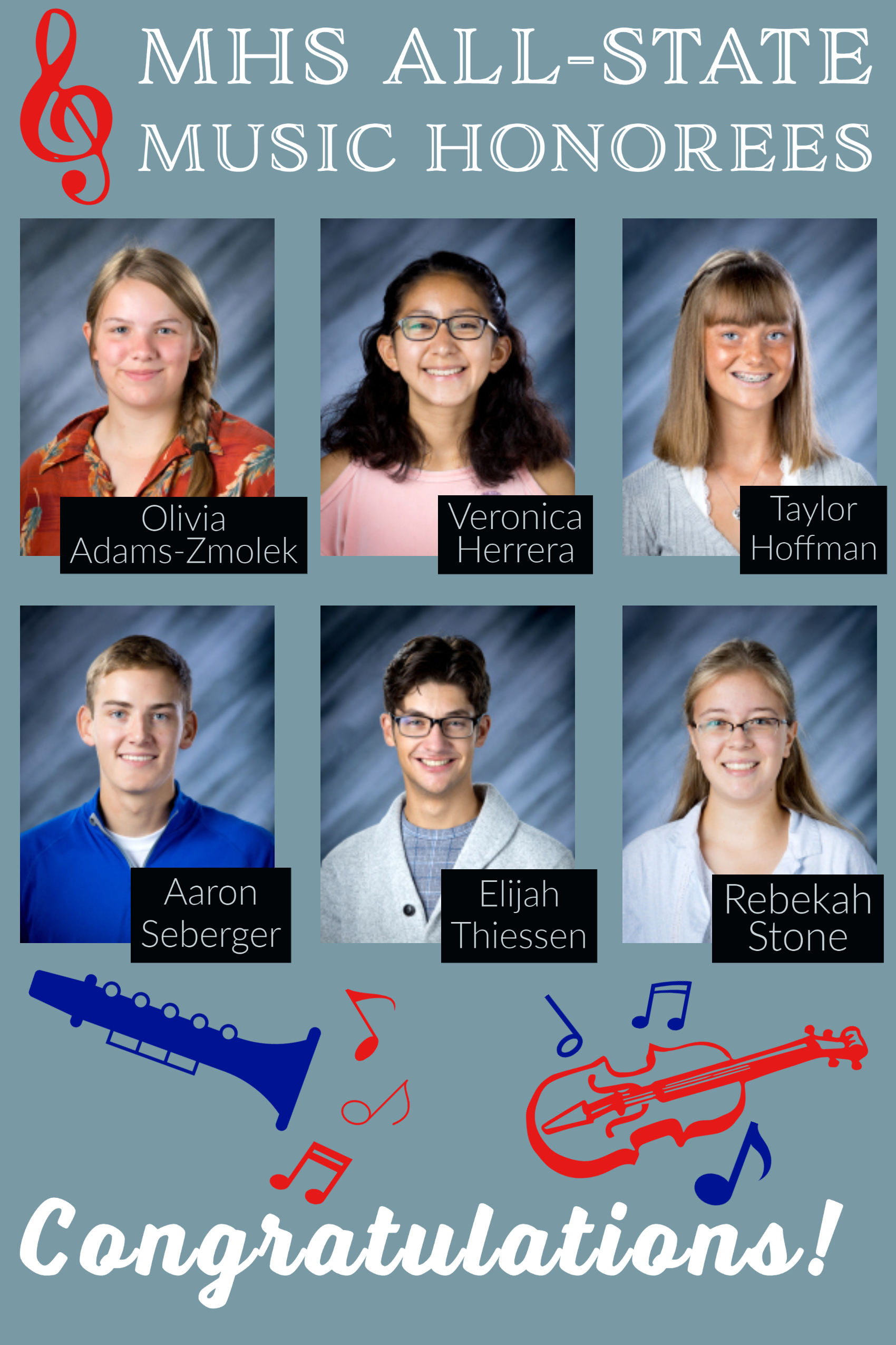 - All-State Chorus: Olivia Adams-Zmolek (second year), Taylor Hoffman, Aaron Seberger, and Elijah Thiessen (fourth year)