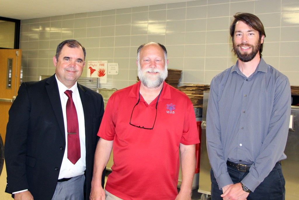 Doug Bacon, center, is retiring from Marshalltown High School after 25 years of service. Also pictured: Superintendent Dr. Theron Schutte (left) and School Board Vice President Sean Heitmann (right).
