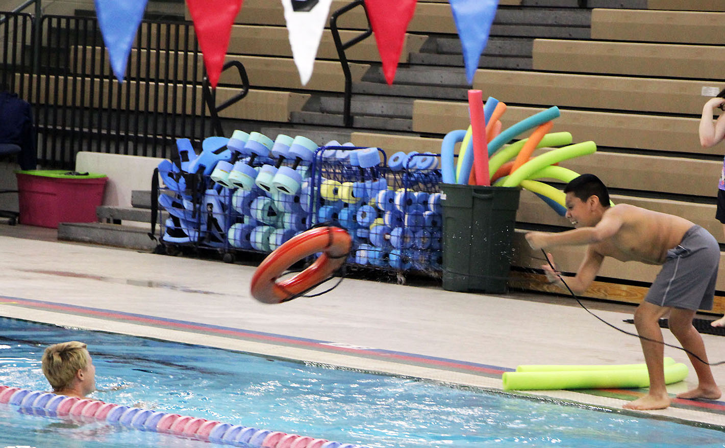 Instead, the students were taught to lay flat on their bellies and reach out with whatever they had on hand. In the demonstration, they used pool noodles and the lifeguard ring.