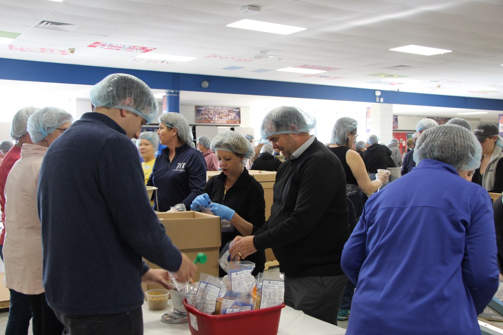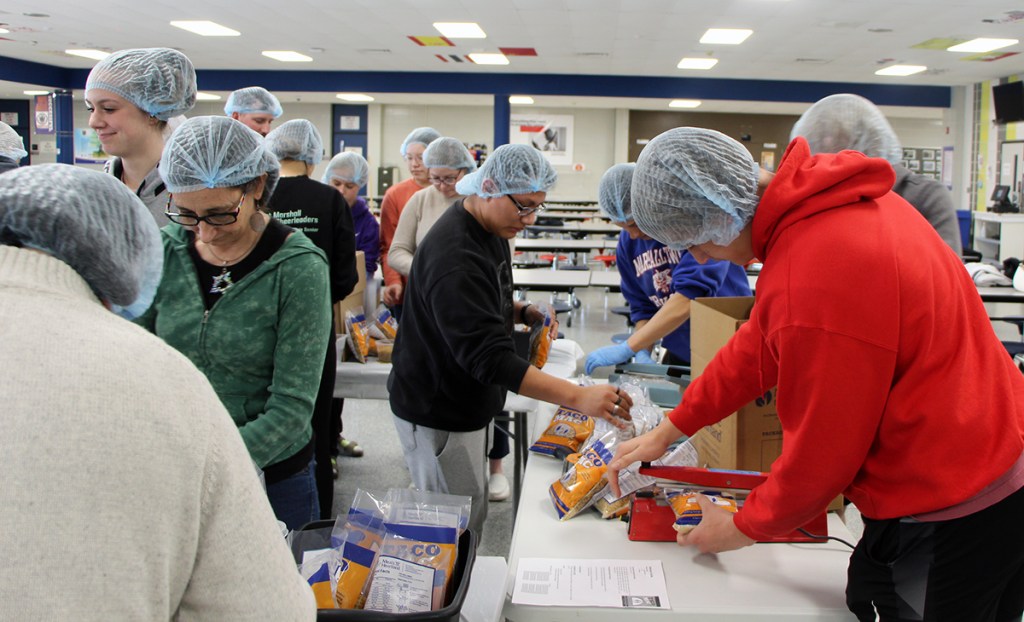 More than 100 volunteers gathered in the Marshalltown High School cafeteria to package 20,000 meals for the hungry in Marshall County on Wednesday. The event was coordinated by student philanthropy groups from Marshalltown, East Marshall, and West Marshall high schools and was sponsored by the Community Foundation of Marshall County (CFMC) and the Martha-Ellen Tye Foundation.