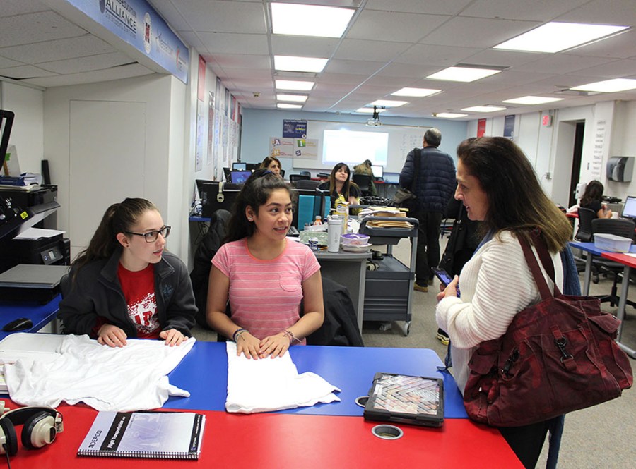 Miller Middle School students McKenna Coleman, left, and Lesley Rios, center, talk to Leila Berishvili, one of the educators visiting MSCD from the country of Georgia on Tuesday. The students were working on t-shirt design at Miller’s Modular Technology classroom.