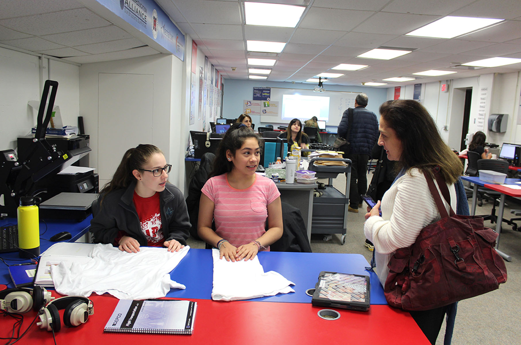 Miller Middle School students McKenna Coleman, left, and Lesley Rios, center, talk to Leila Berishvili, one of the educators visiting MSCD from the country of Georgia on Tuesday. The students were working on t-shirt design at Miller’s Modular Technology classroom.