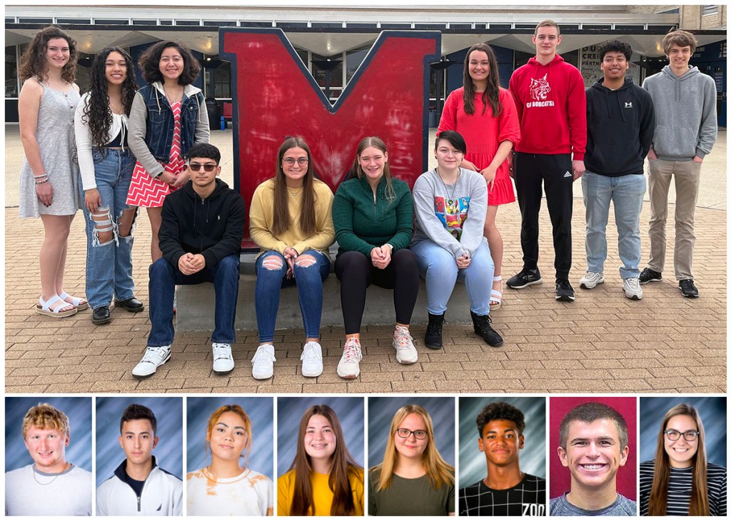 AT TOP: Class of 2022 dual graduates (from left) Alivia Eaton, Rochelle Avalos, Veronica Herrera, Alejandro Rivas Alanis, Taylor Jones, Lilly Duff, Erin Stanley, Cassidy Wedemeyer, Marcus Barker, Jose Manuel Vergara, and Jonah Landas gather outside of MHS. AT BOTTOM: Also among this year’s dual graduates are (from left): Hunter Block, Uriel Botello, Jackelyn Bravo Hernandez, Brenna Hempy, Zoe Johnson, Javon Lewis, Levi Ogston, and Paige Wertzberger