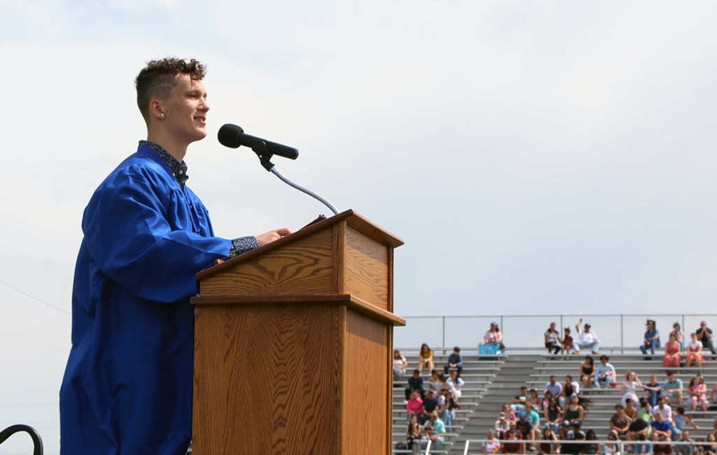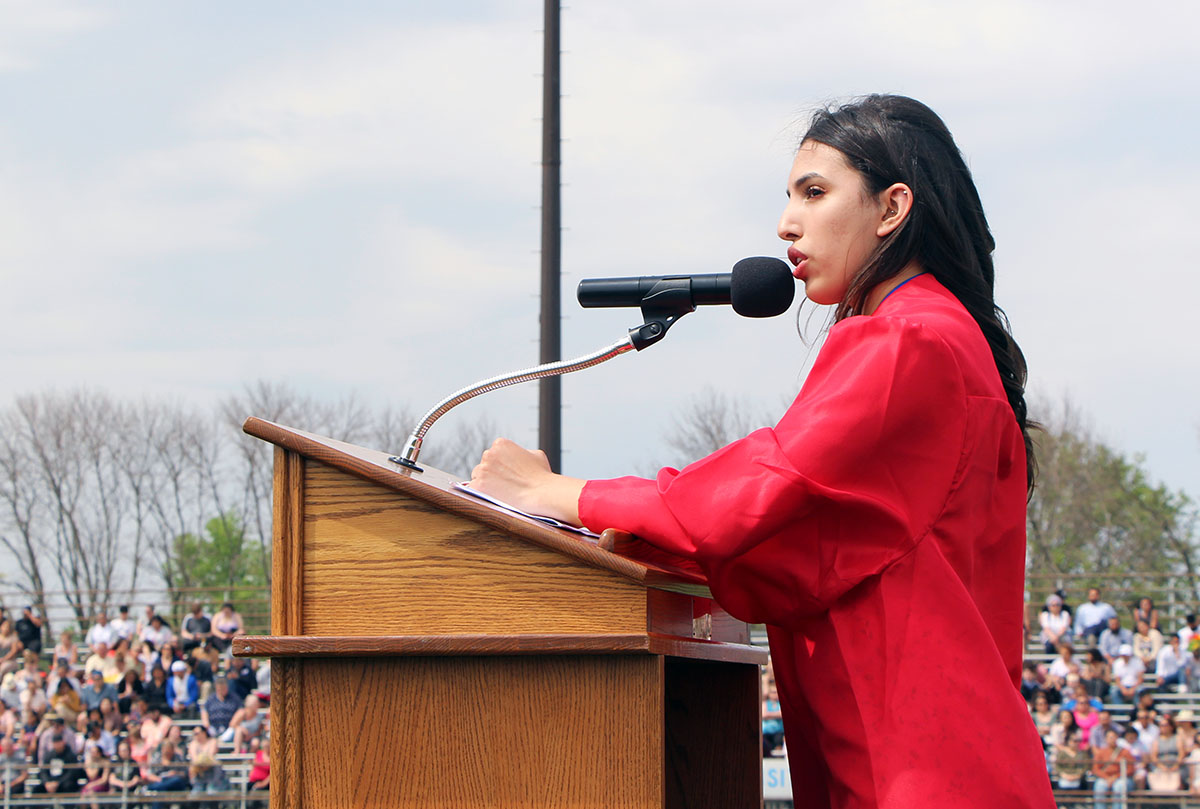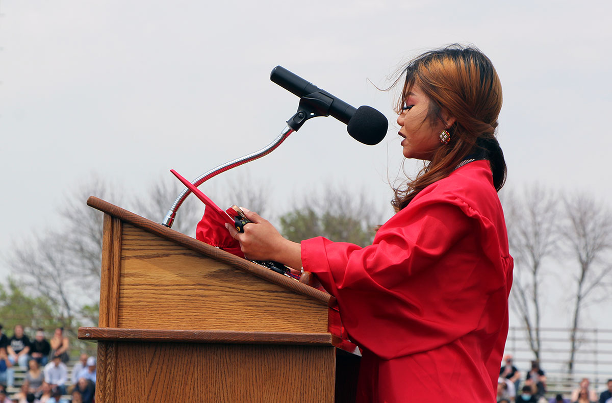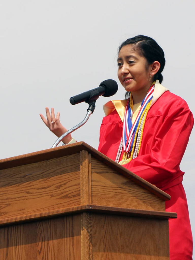 Andrea Montes Melendez gives an inspiring speech for her classmates and the gathered audience at the Commencement Ceremony. Fellow student speakers included Veronica Herrera, Jackson Matteson, and Noelani Berg.