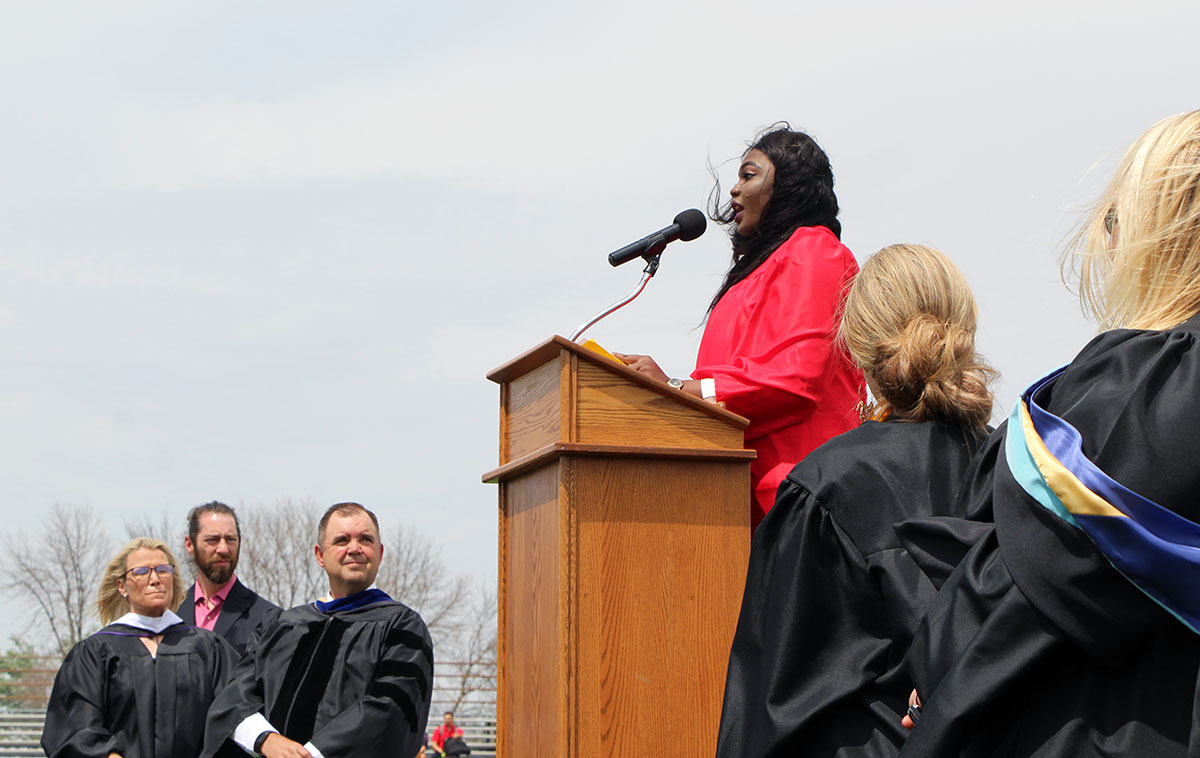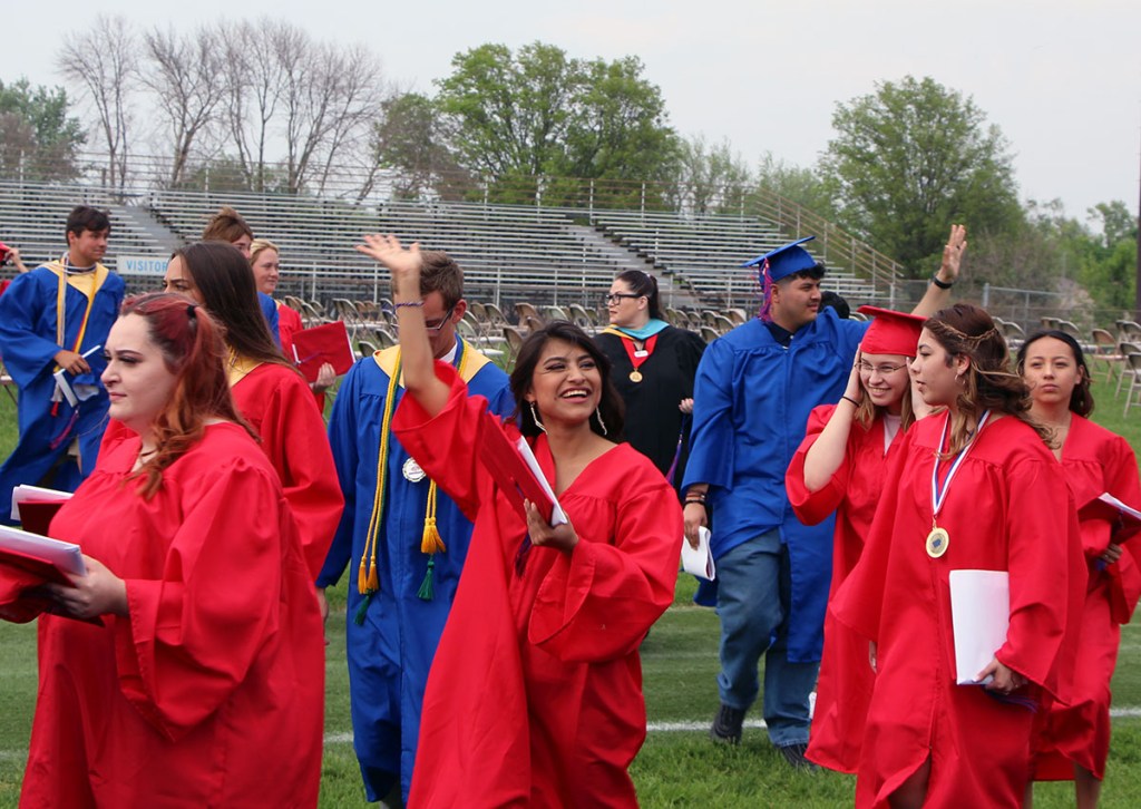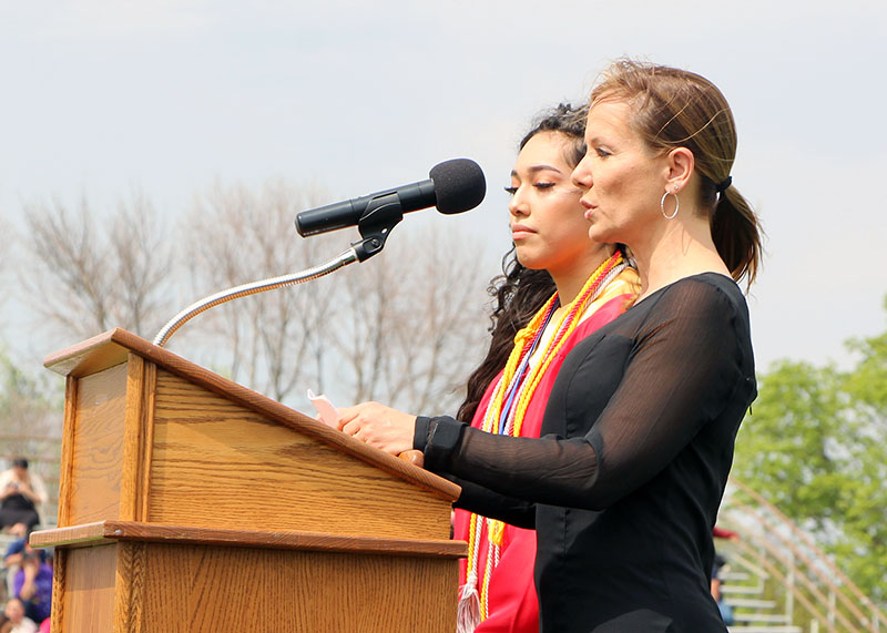 Student speakers gave inspiring speeches to their fellow graduates, who were spread across the windswept football field. One of the speakers, Andrea Montes Melendez, said the welcoming, caring teachers and school staff at Marshalltown High School were key to her success in facing many challenges, including becoming proficient in English in just two years.