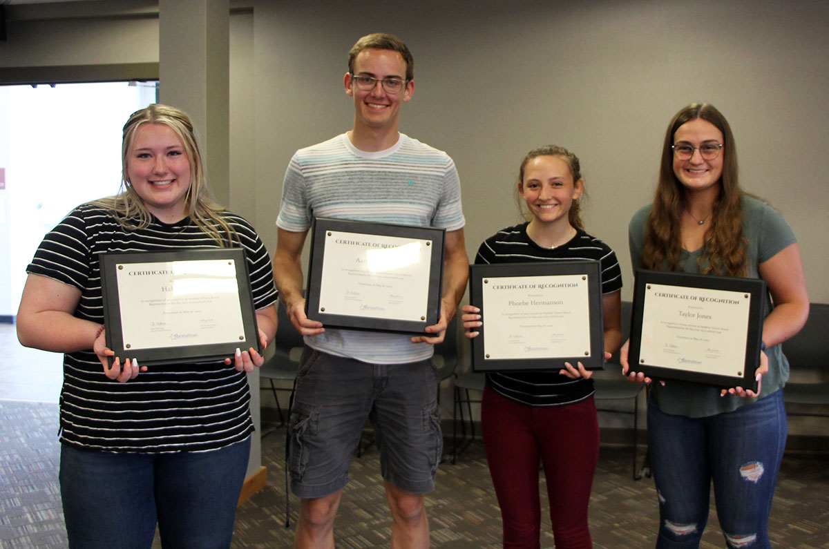 2021-22 Marshalltown School Board student representatives (from left) Haley Reed, Aaron Seberger, Phoebe Hermanson, and Taylor Jones were presented with certificates of recognition at Monday’s regular meeting.