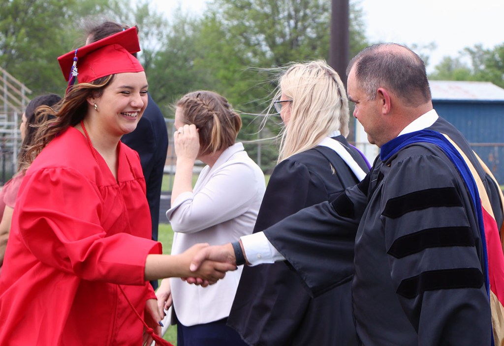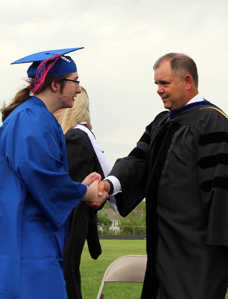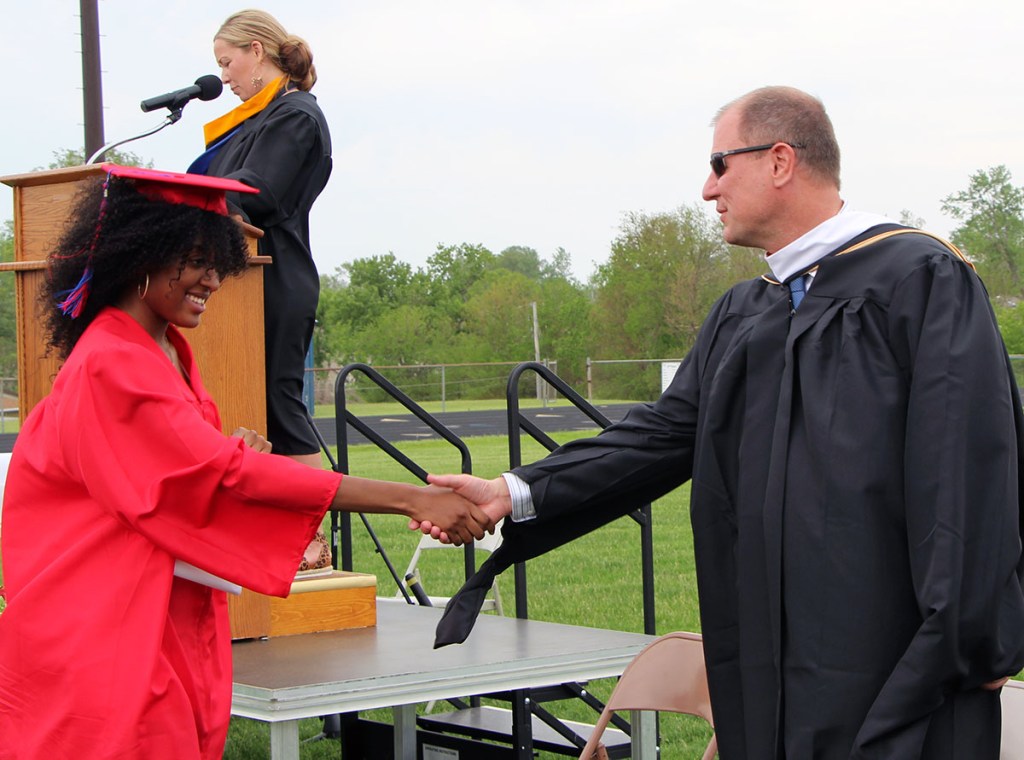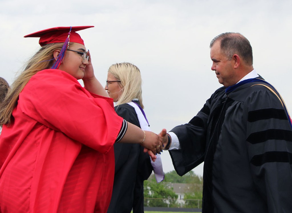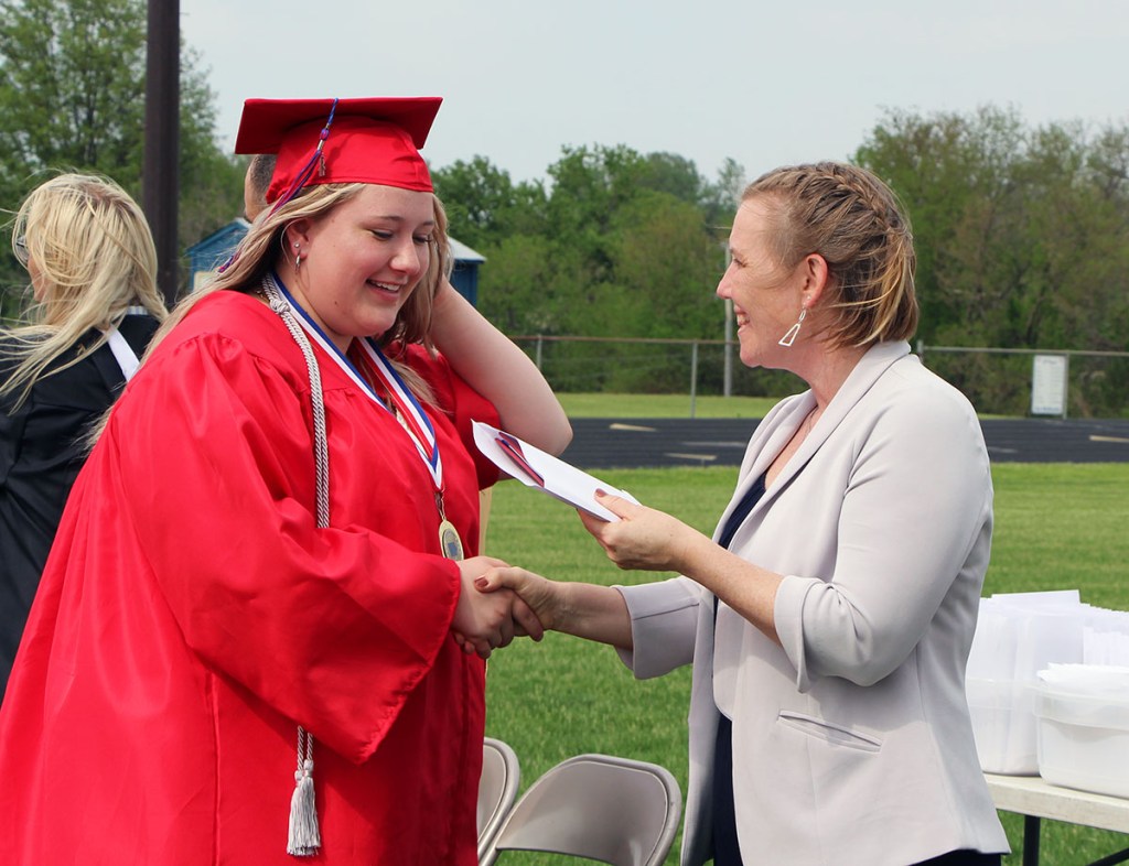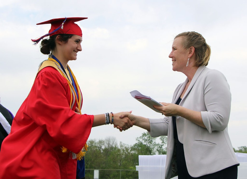 MHS Principal Jacque Wyant (left) shakes hands with Phoebe Hermanson (right).