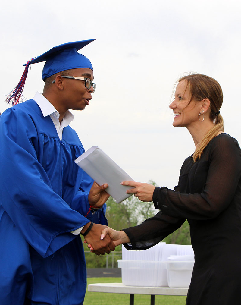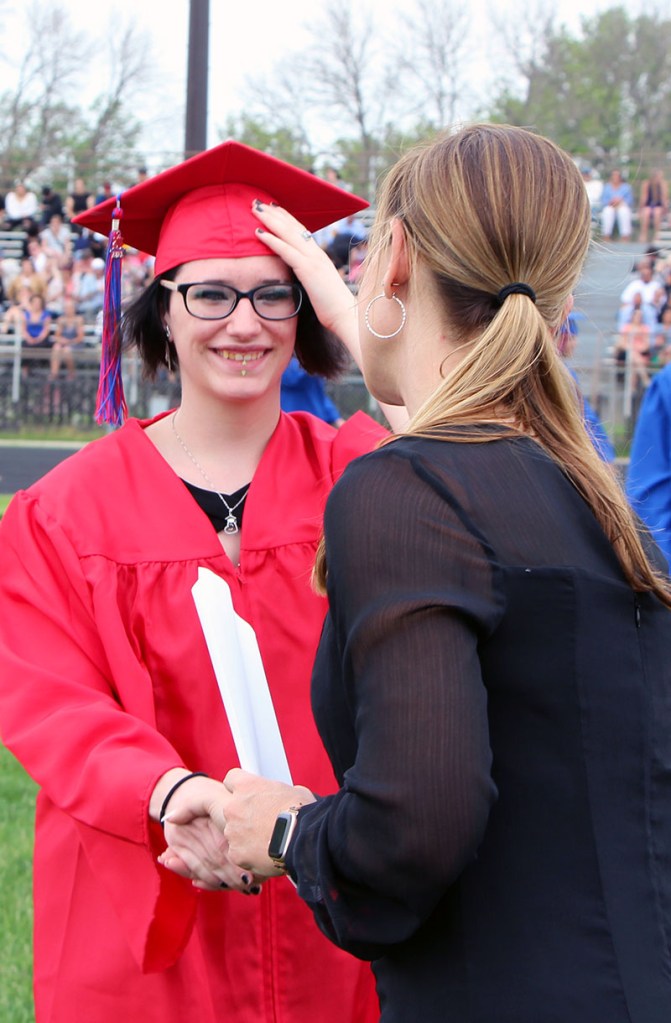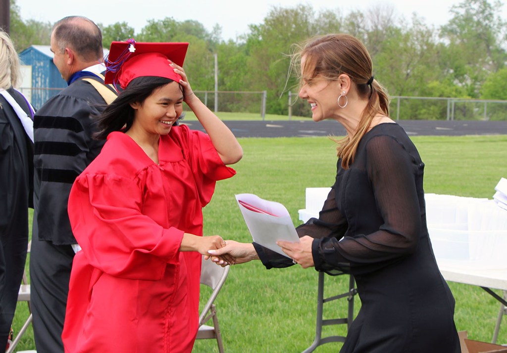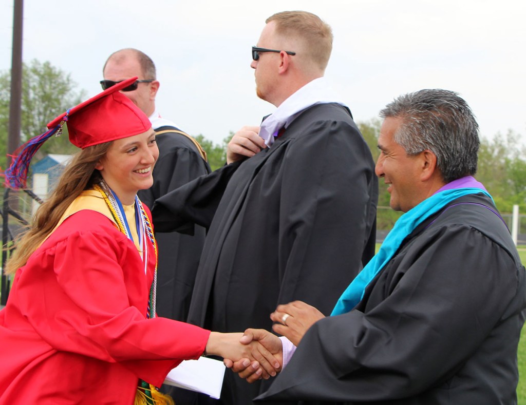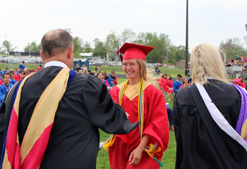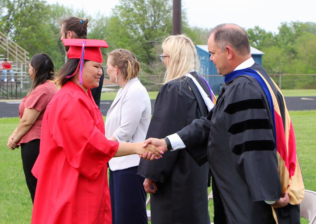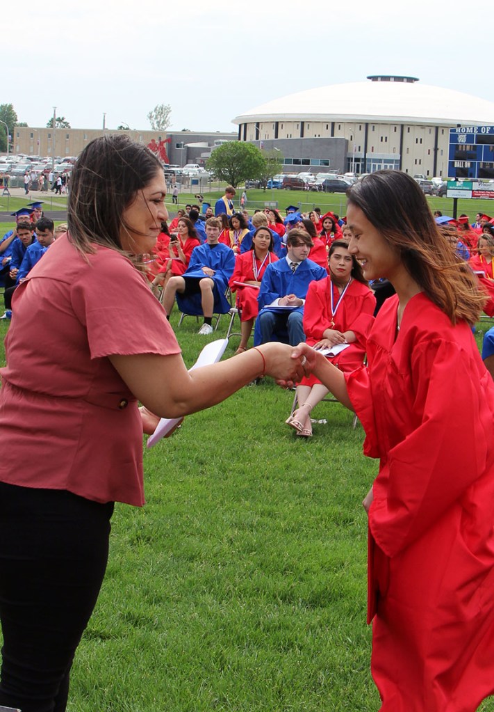 MHS Principal Jacque Wyant (left) shakes hands with Phoebe Hermanson (right).